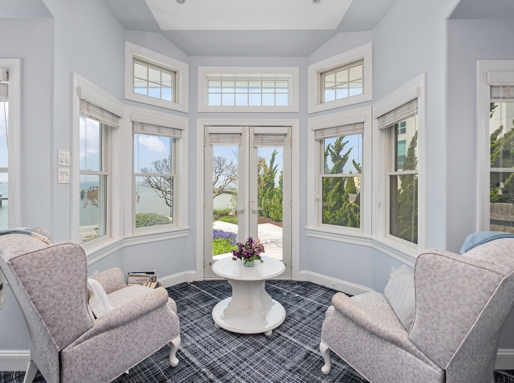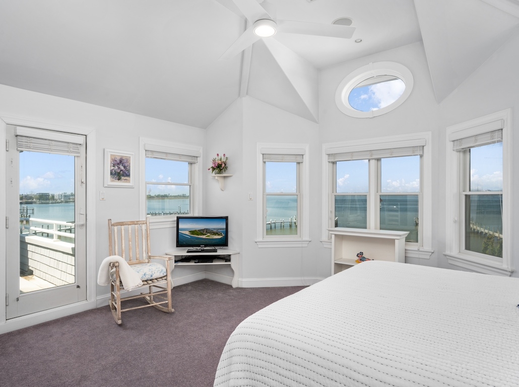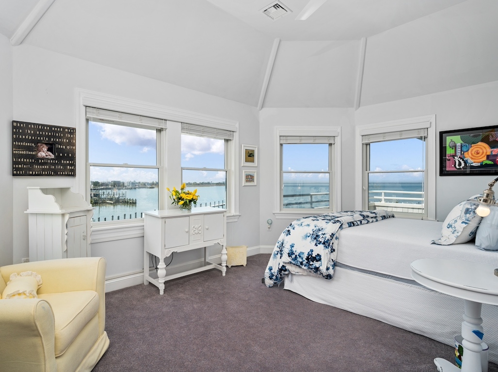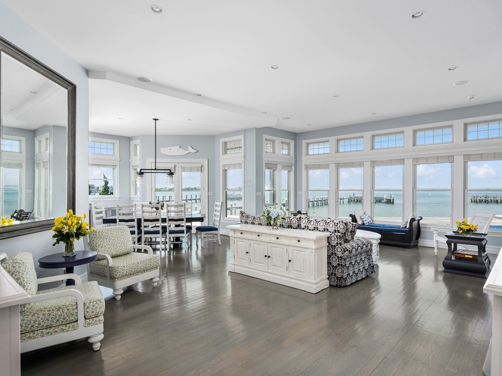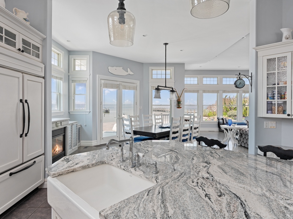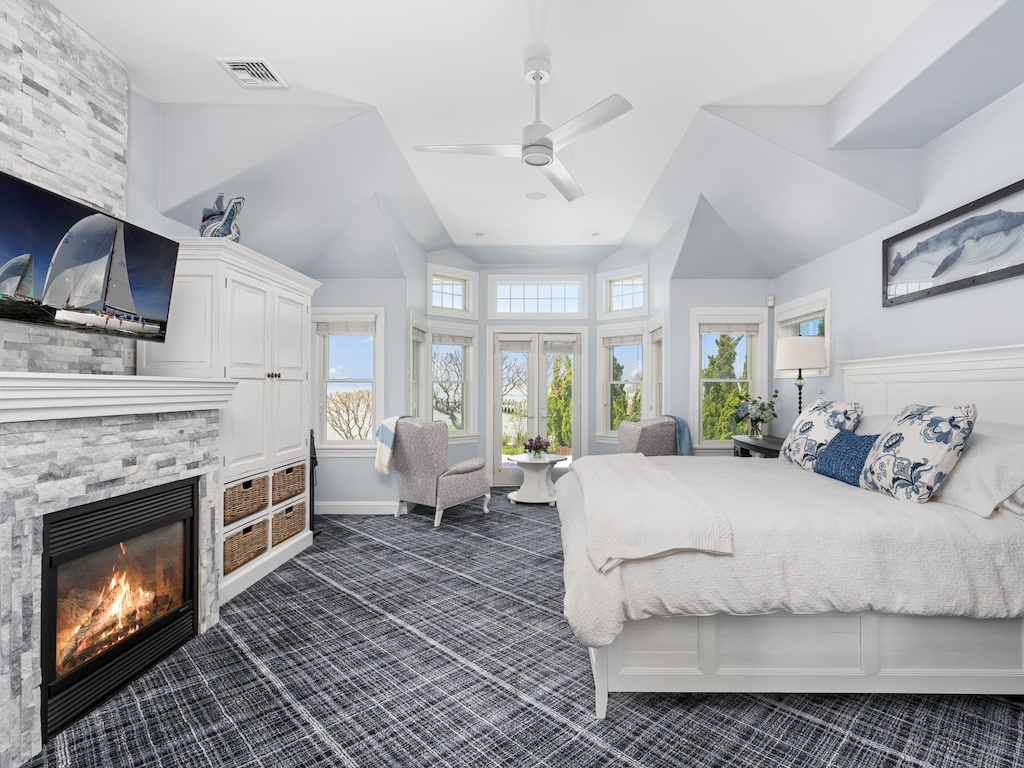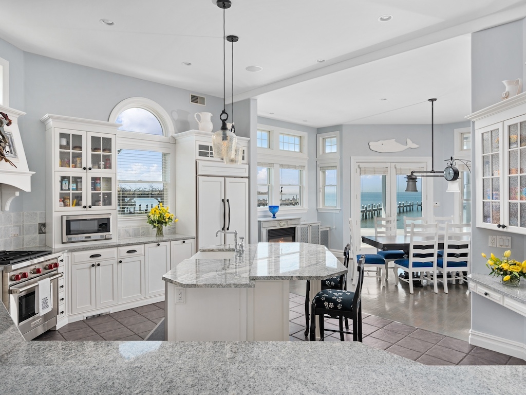Sunken living room, dining room, and kitchen with endless perspectives of sea and sky. Additional family room with waterfront balcony, large theater room, office, and gym easy for converting into more bedrooms and baths (should your growing family require). Spacious Primary Suite on the first level with reading nook, stone fireplace, and sumptuous bath including glass shower and clawfoot tub.