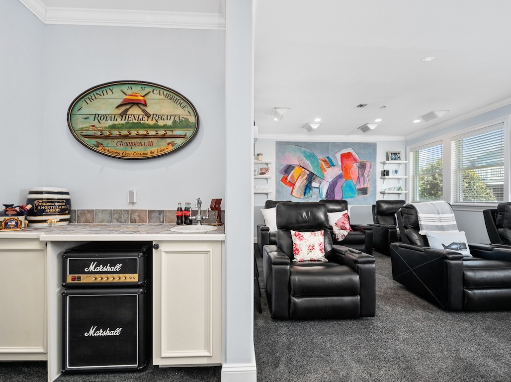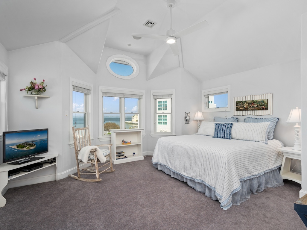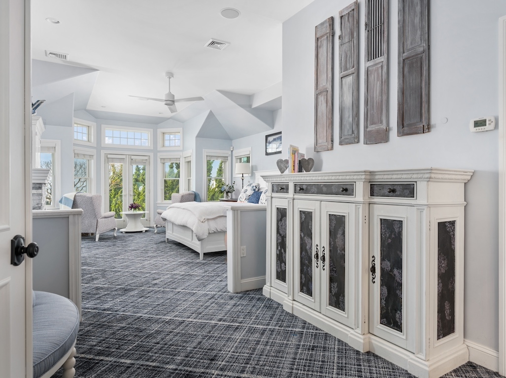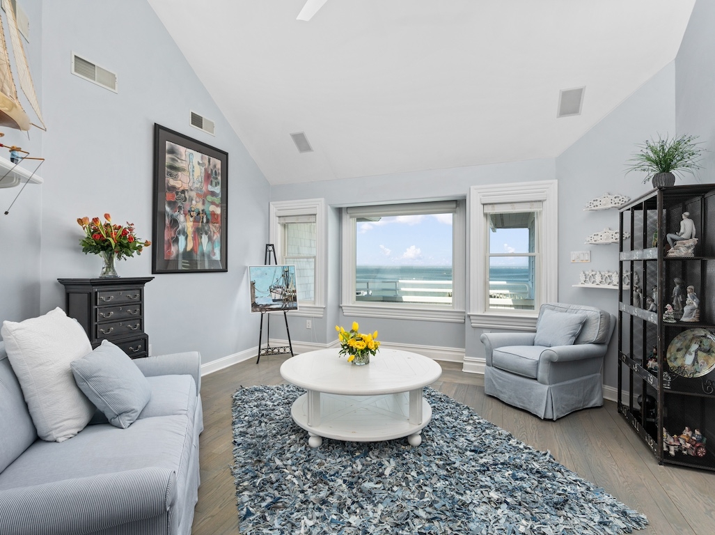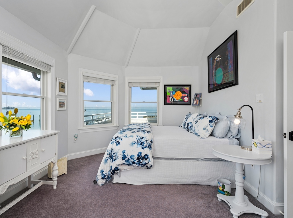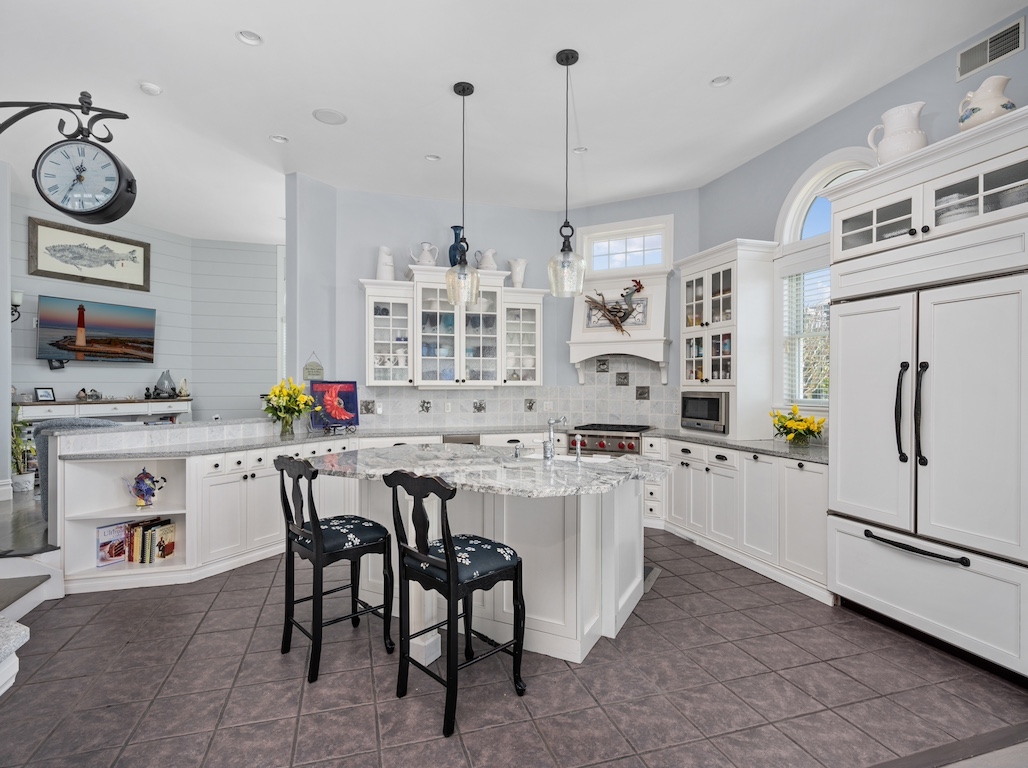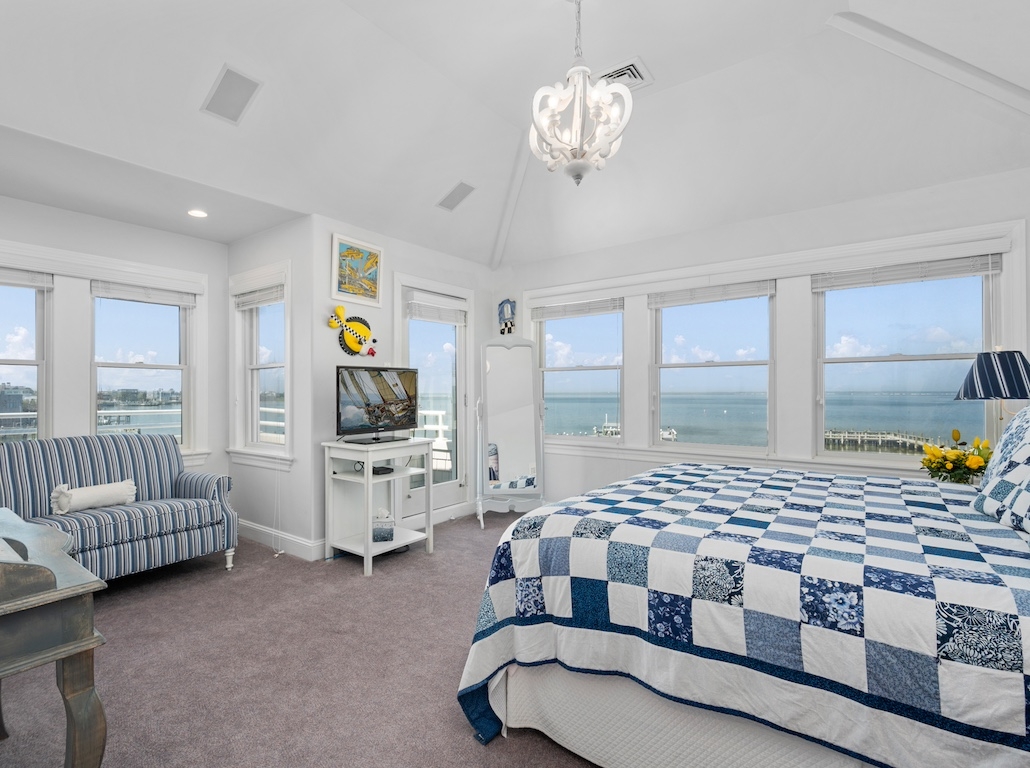 Sunken living room, dining room, and kitchen with endless perspectives of sea and sky. Additional family room with waterfront balcony, large theater room, office, and gym easy for converting into more bedrooms and baths (should your growing family require). Spacious Primary Suite on the first level with reading nook, stone fireplace, and sumptuous bath including glass shower and clawfoot tub.