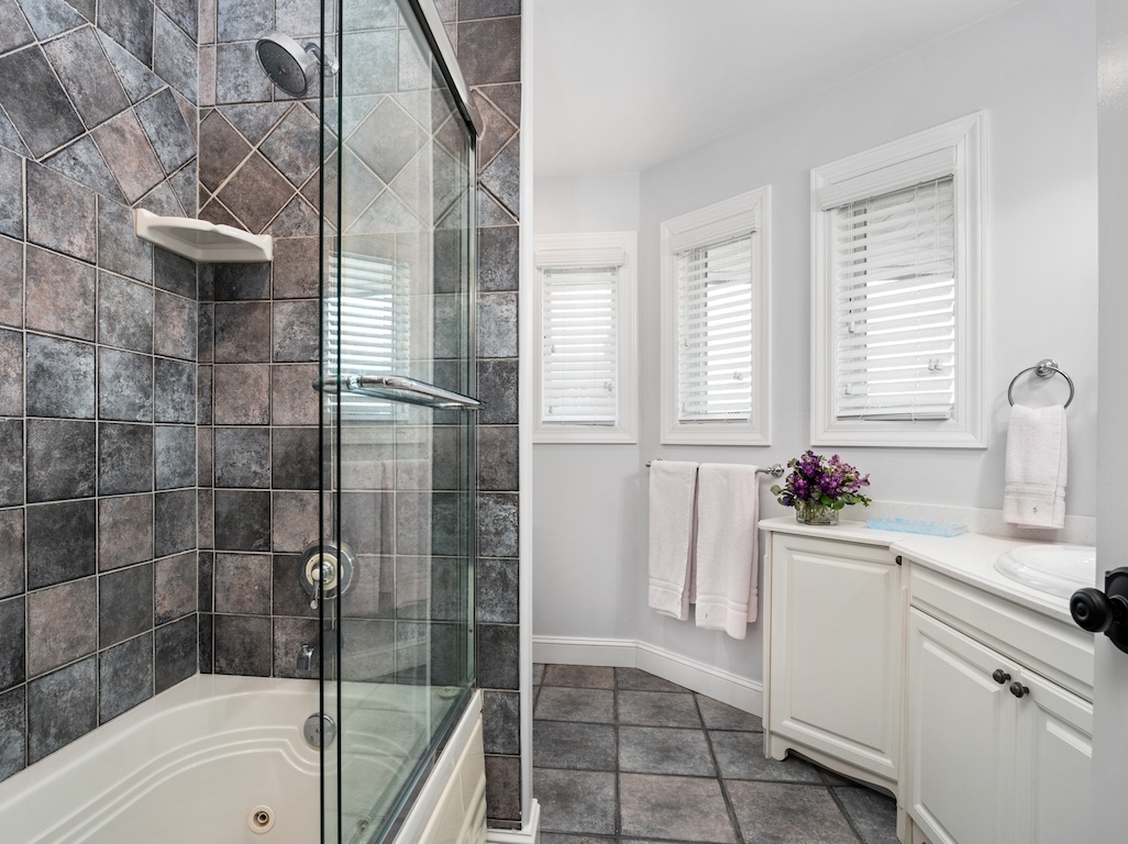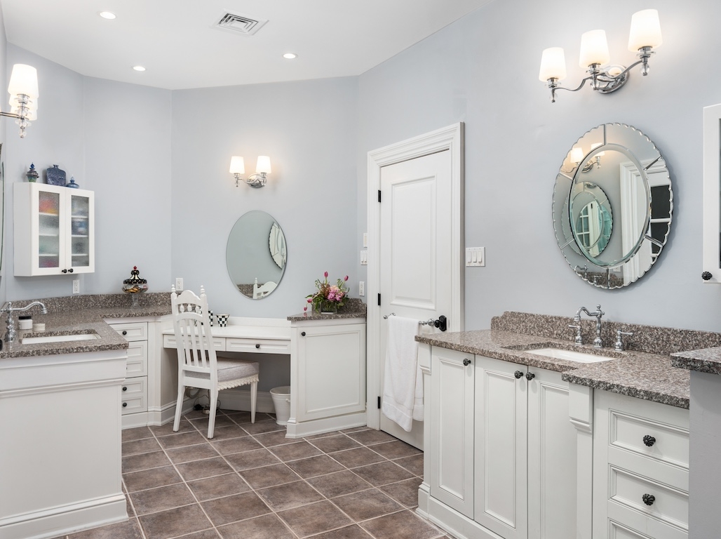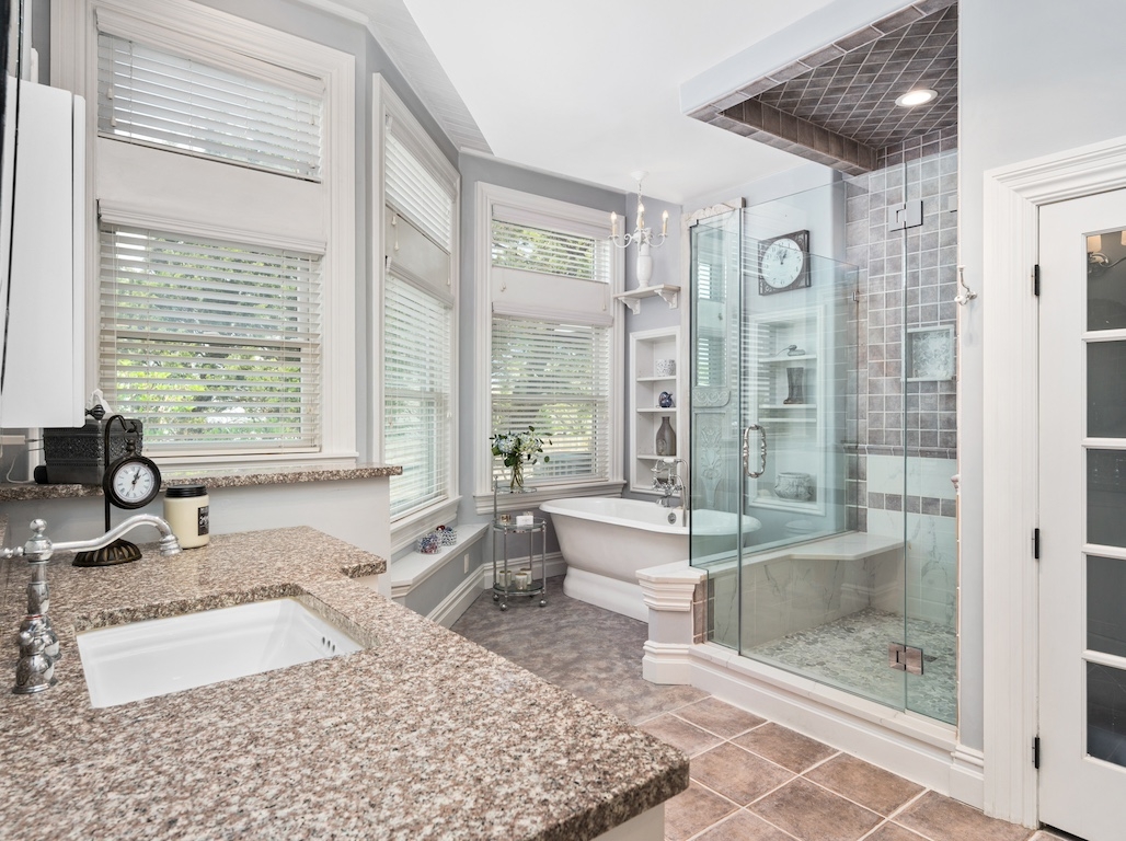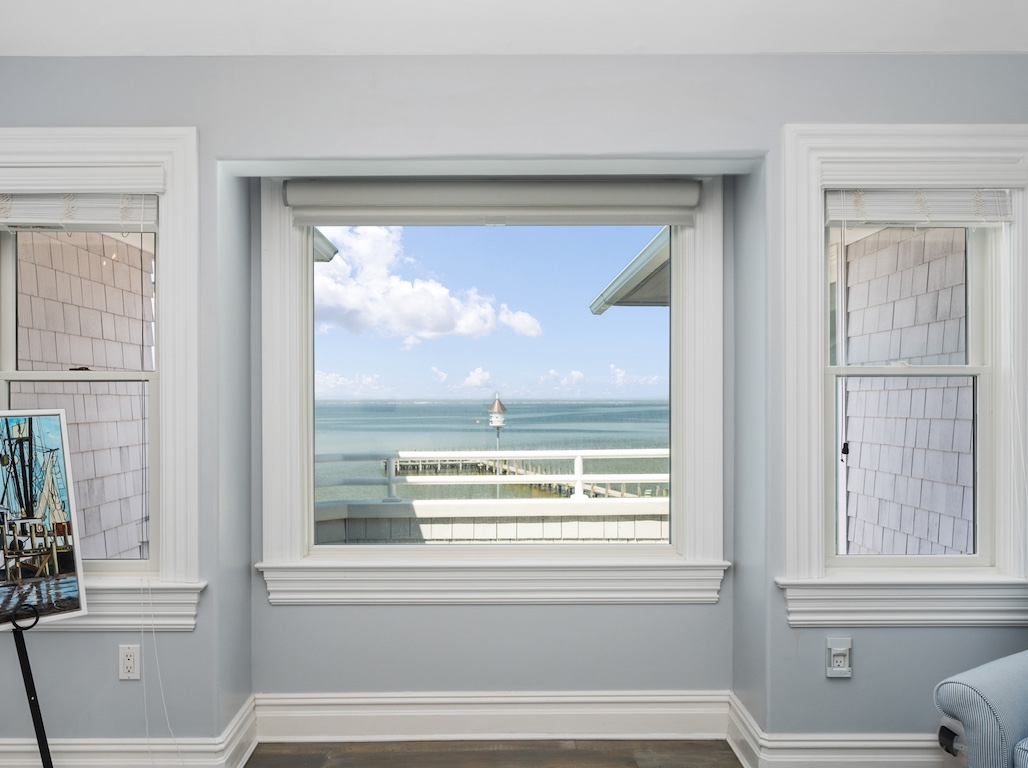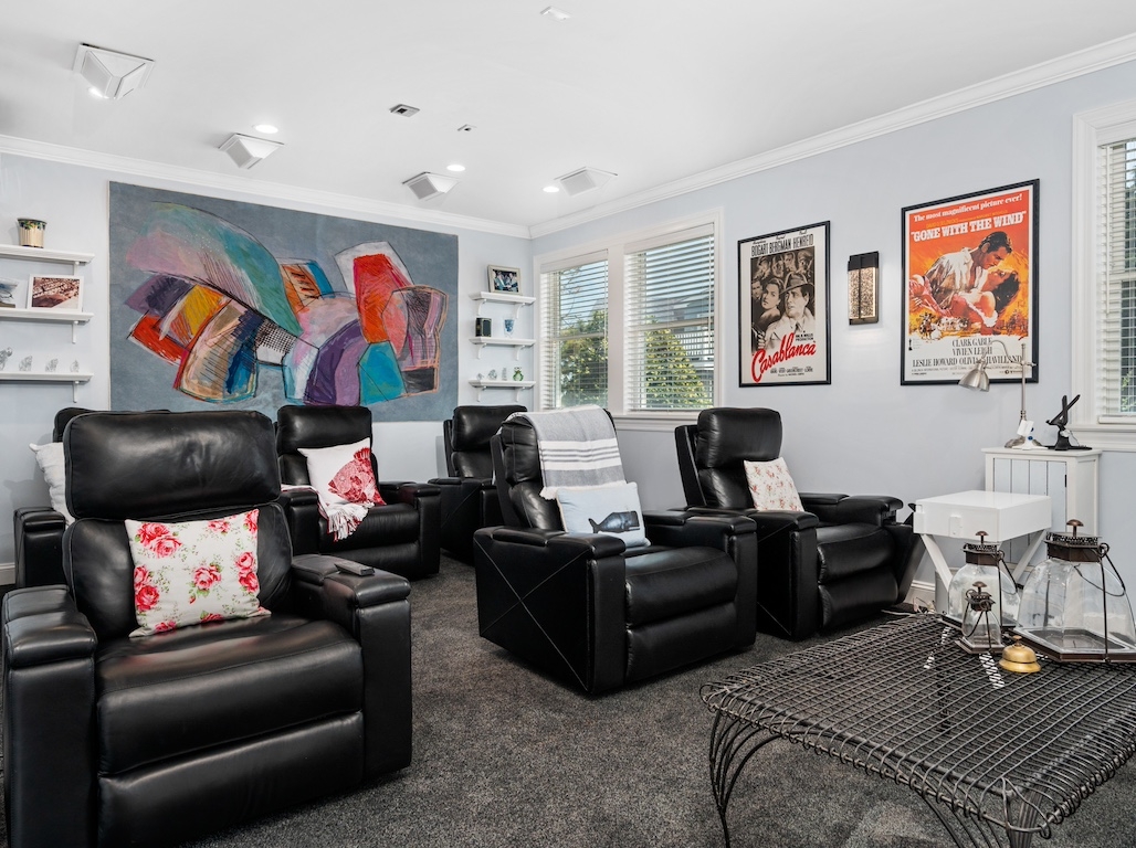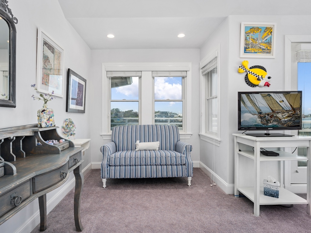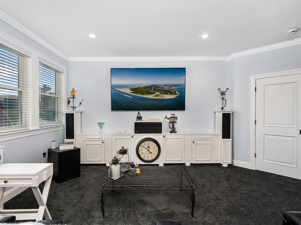 Sunken living room, dining room, and kitchen with endless perspectives of sea and sky. Additional family room with waterfront balcony, large theater room, office, and gym easy for converting into more bedrooms and baths (should your growing family require). Spacious Primary Suite on the first level with reading nook, stone fireplace, and sumptuous bath including glass shower and clawfoot tub.