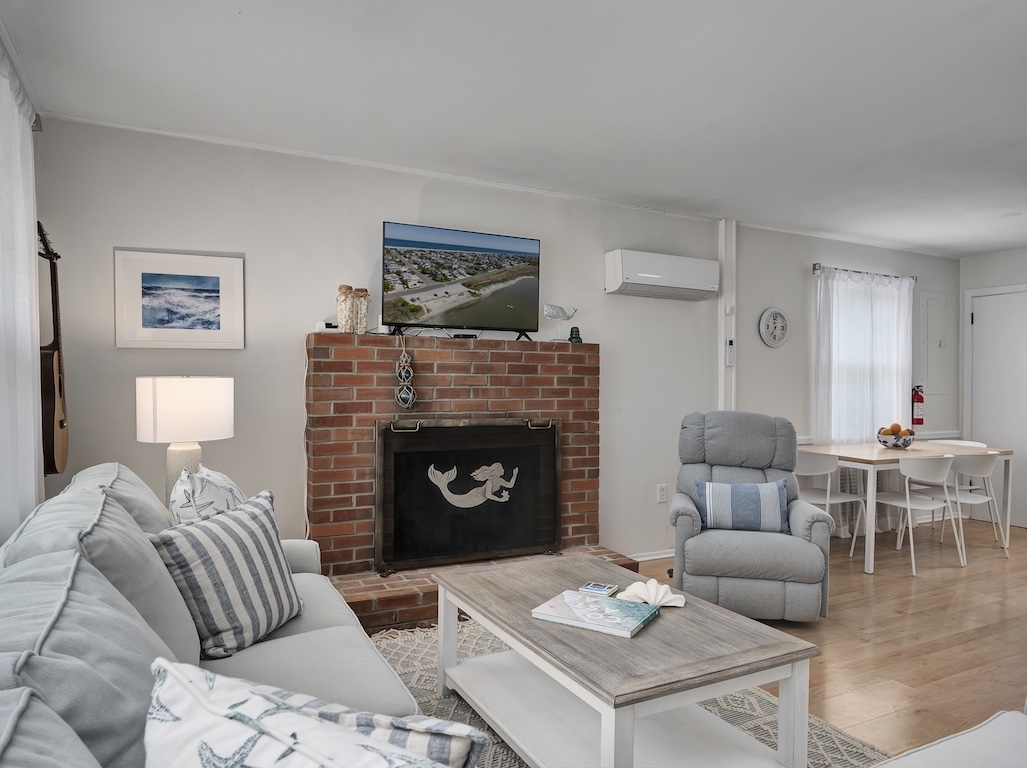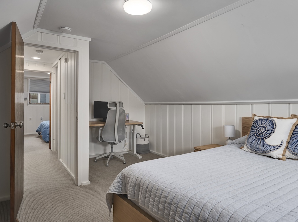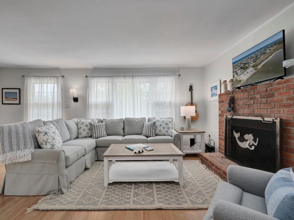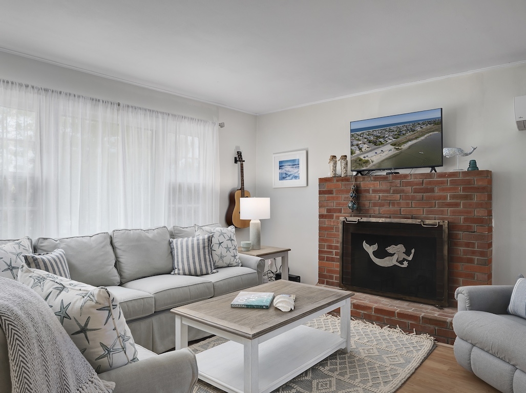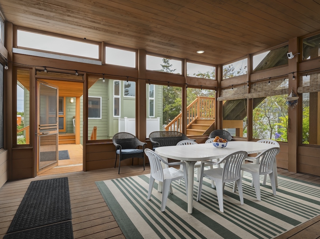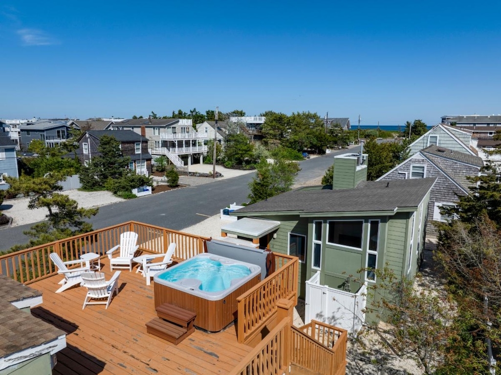 The main Cape Cod features 4 bedrooms and 2 full baths, connected by a breezeway to a spacious modern accessory cottage—complete with its own bedroom, bath, kitchenette, and generous living and dining space. Privately tucked between the two structures is a large screened-in porch with a rooftop deck, hot tub, and ample room for sun bathing.