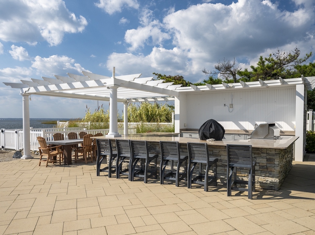 Step outside to your own resort-style setting featuring a 14’ x 40’ gunite pool with a lounging shelf, surrounded by expansive patios designed for sun, relaxation, and waterfront enjoyment. The outdoor kitchen, complete with granite countertops and a shaded trellis, is ideal for alfresco dining and sunset cocktails.