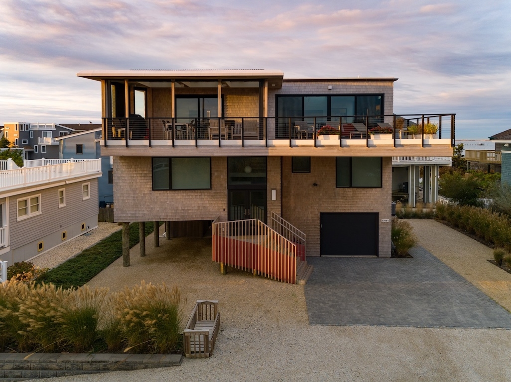 Steel and vertical cedar cantilevered decking with bi-fold doors connect the main living floor to both open, covered, and screened decks. Perched comfortably on a bluff-like point, outside of any flood risk, the views of Barnegat Bay are intoxicating and hypnotizing. The open floor plan kitchen, dining and living areas have walls of glass and skylights that flood the interior with sun light, framing the bay while making the ceiling appear to float. The master suite occupies one wing of the house affording privacy and remarkable water views. Three en-suite guest bedrooms are separately situated. A three-stop elevator and floating staircase provide seamless access to all levels of this brilliantly designed beach house.