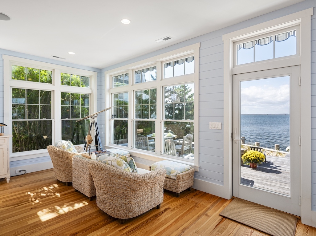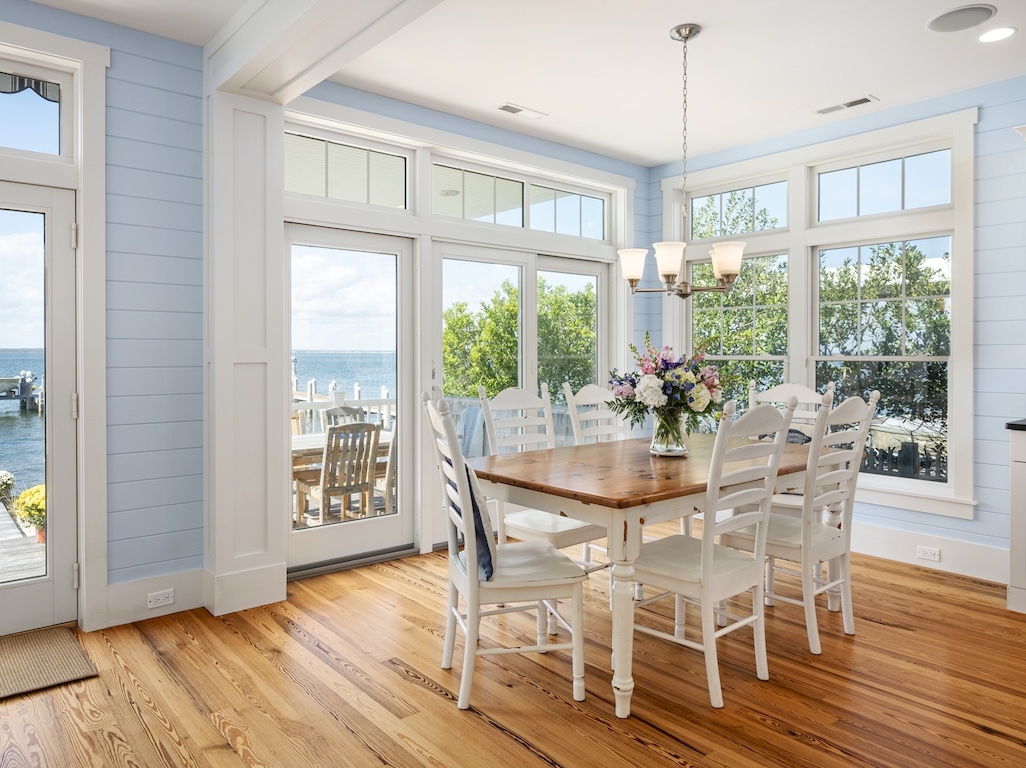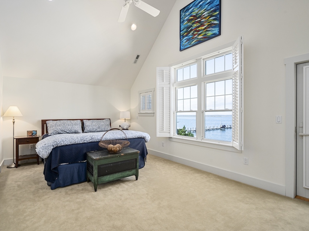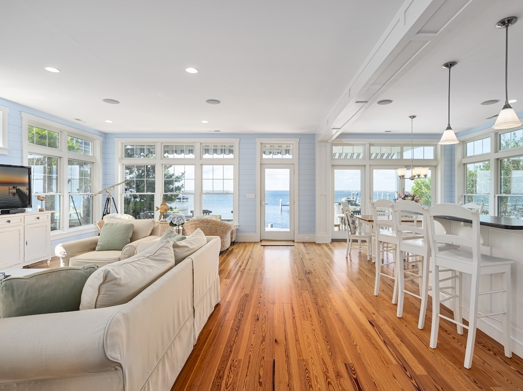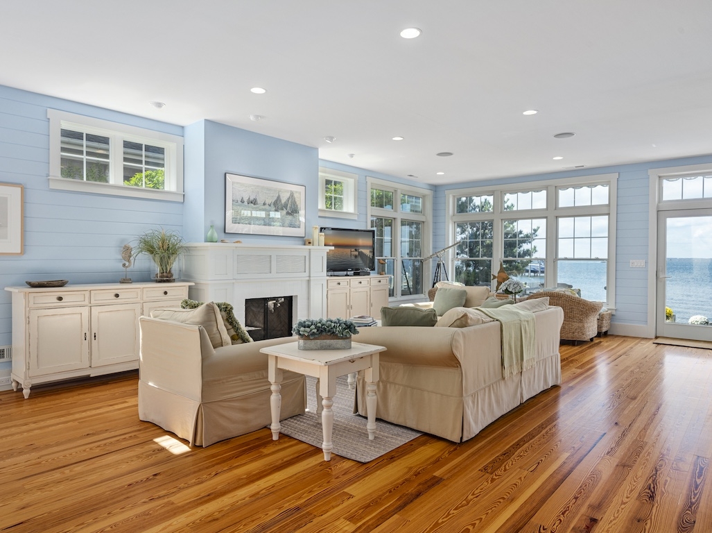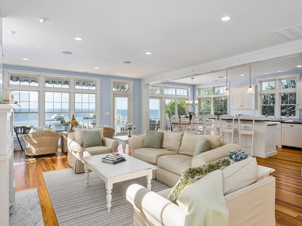 Easy, non-reverse living layout with the boating lifestyle in mind, the interiors of this Nantucket shingle-style are a soft pallet of hydrangea blues and greens with ample use of ship lap creating a nautical vibe. Delighting the most discerning of buyers, you’ll walk through the welcoming blue door and enter a light-filled living room with gas fireplace, dining area, and kitchen— all with hardwood flooring and waterfront windows from knee to ceiling including. Transom windows allow natural light to warm a timeless interior.