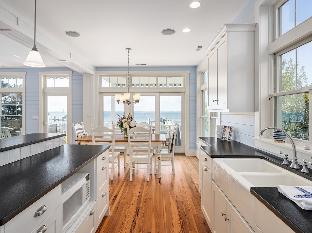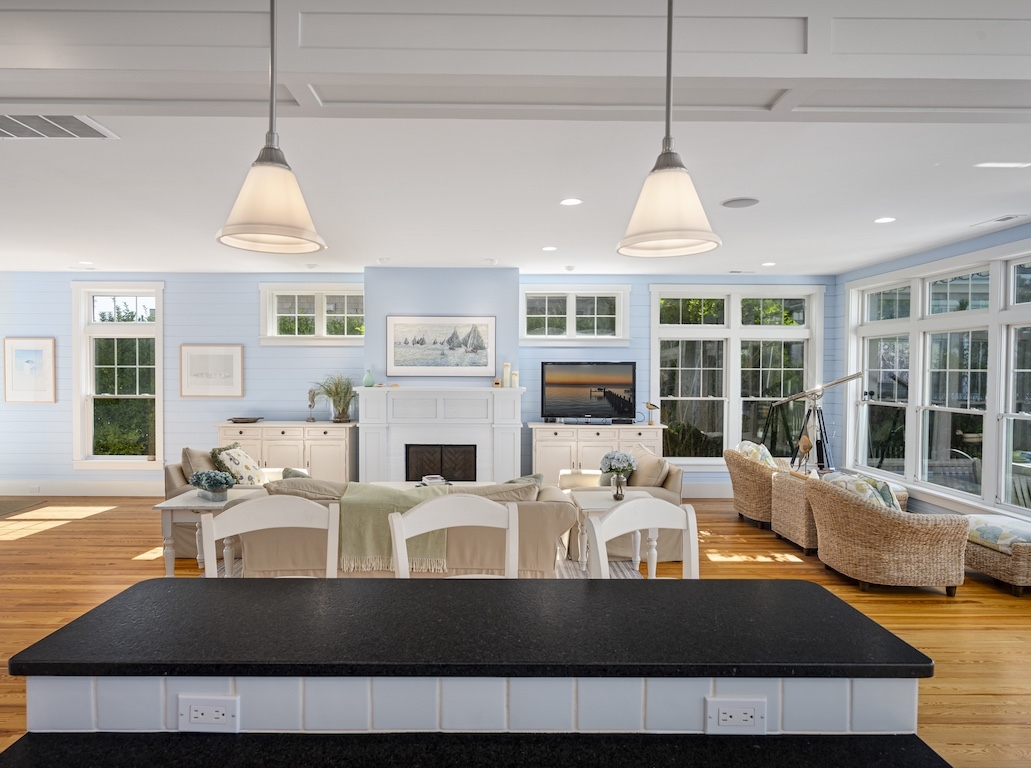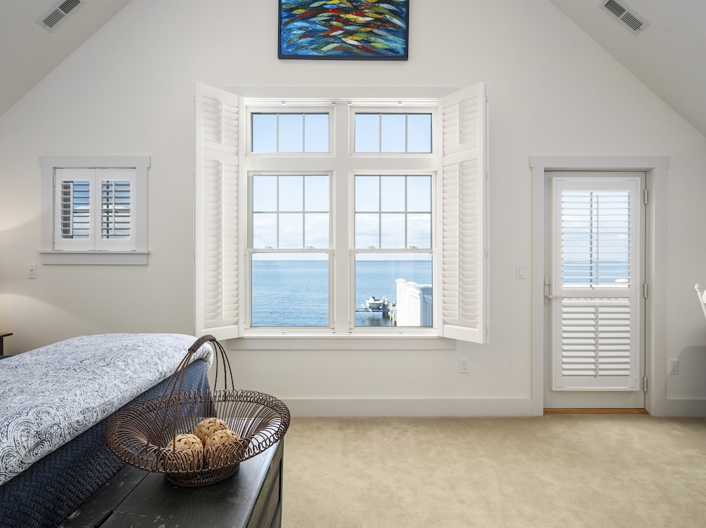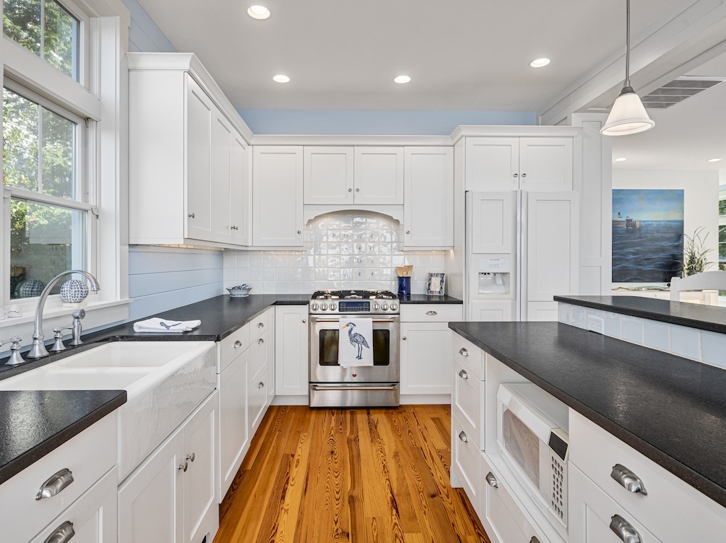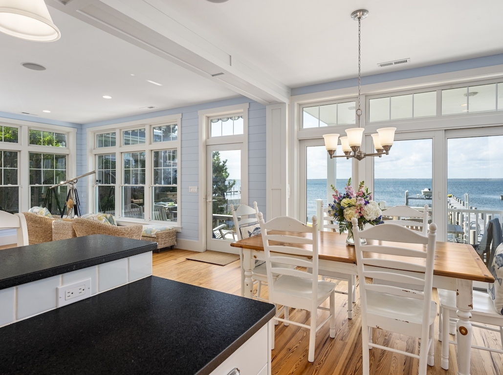 Easy, non-reverse living layout with the boating lifestyle in mind, the interiors of this Nantucket shingle-style are a soft pallet of hydrangea blues and greens with ample use of ship lap creating a nautical vibe. Delighting the most discerning of buyers, you’ll walk through the welcoming blue door and enter a light-filled living room with gas fireplace, dining area, and kitchen— all with hardwood flooring and waterfront windows from knee to ceiling including. Transom windows allow natural light to warm a timeless interior.