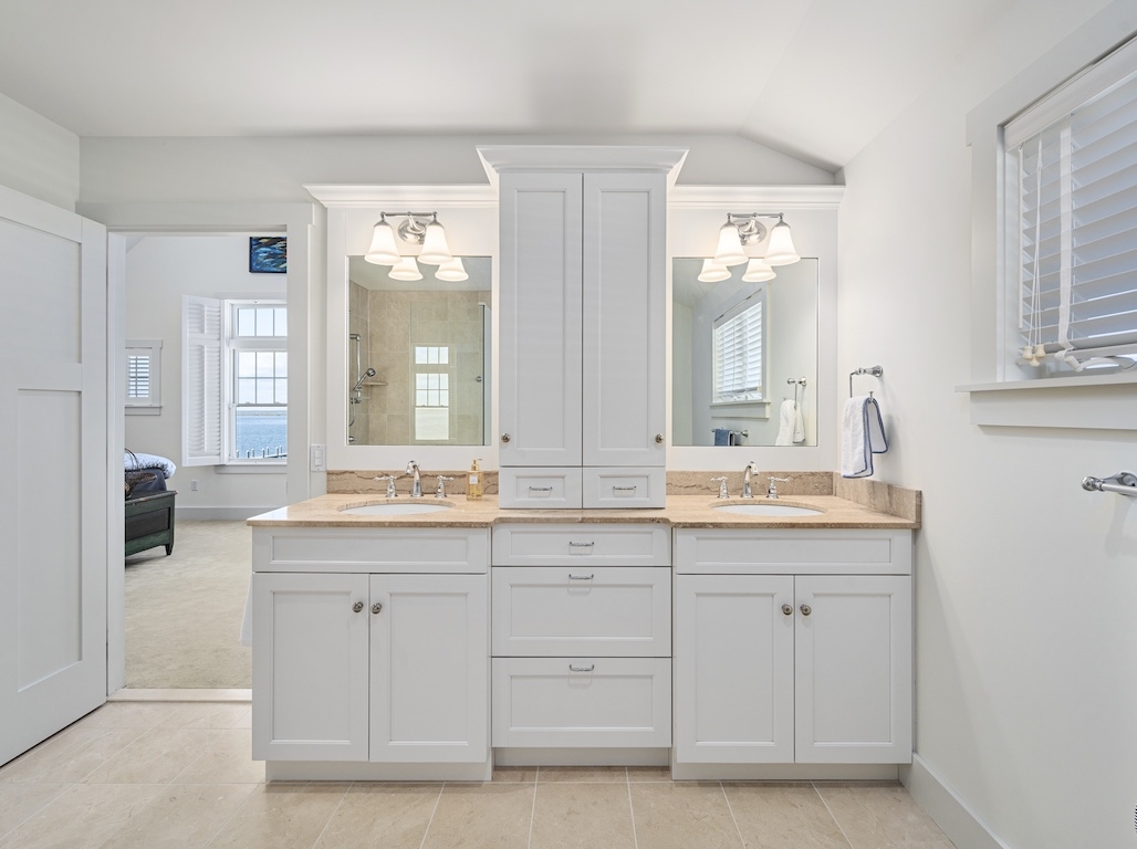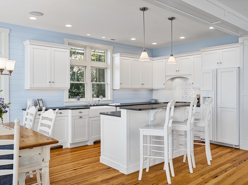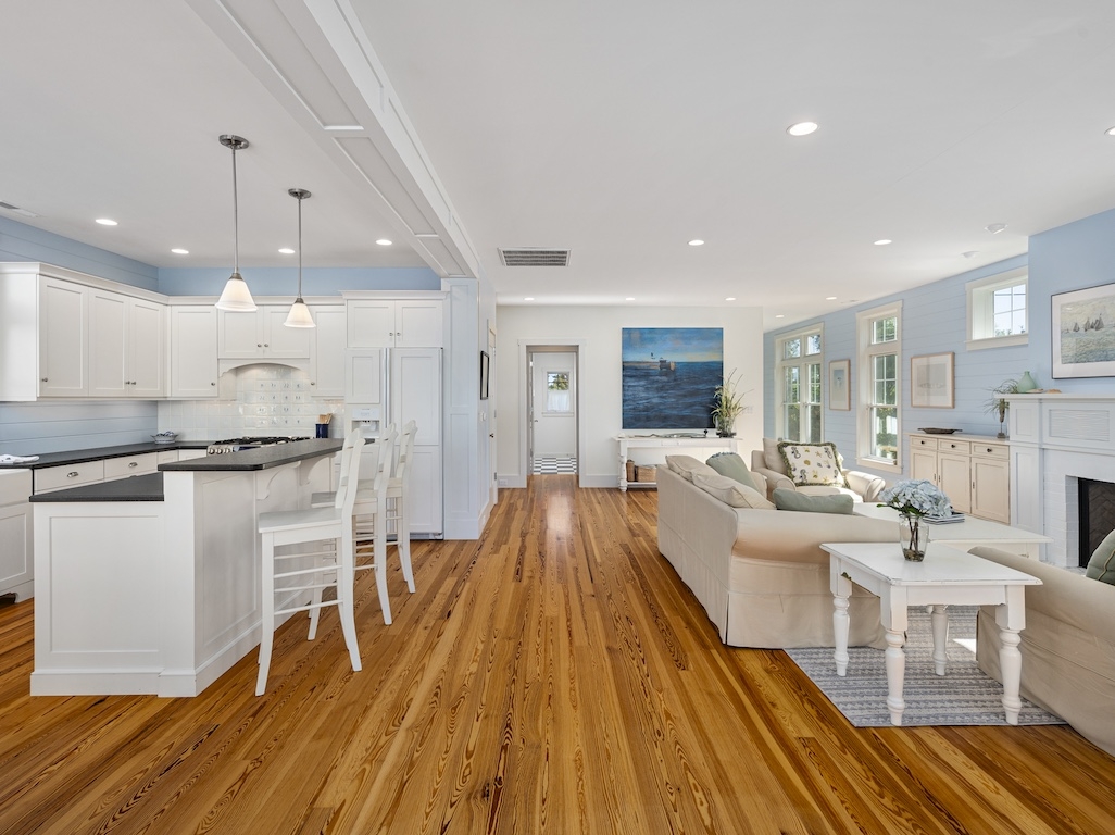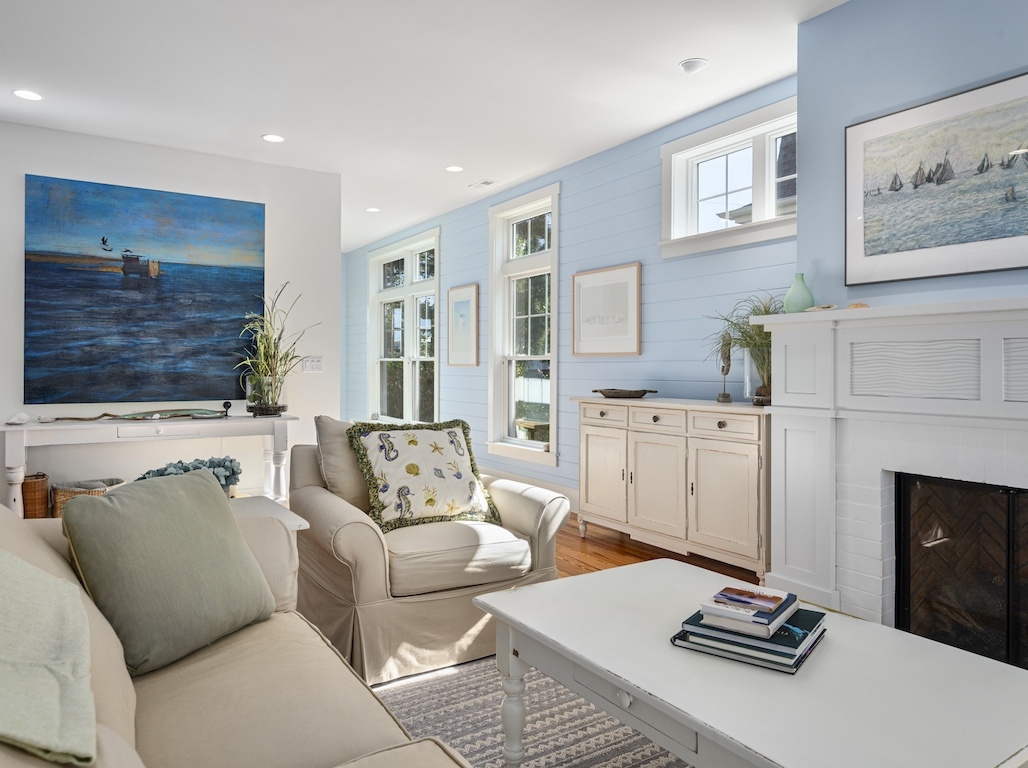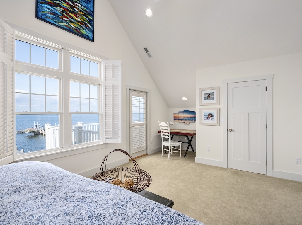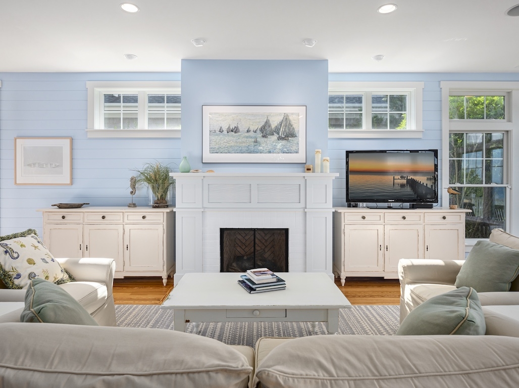 Easy, non-reverse living layout with the boating lifestyle in mind, the interiors of this Nantucket shingle-style are a soft pallet of hydrangea blues and greens with ample use of ship lap creating a nautical vibe. Delighting the most discerning of buyers, you’ll walk through the welcoming blue door and enter a light-filled living room with gas fireplace, dining area, and kitchen— all with hardwood flooring and waterfront windows from knee to ceiling including. Transom windows allow natural light to warm a timeless interior.