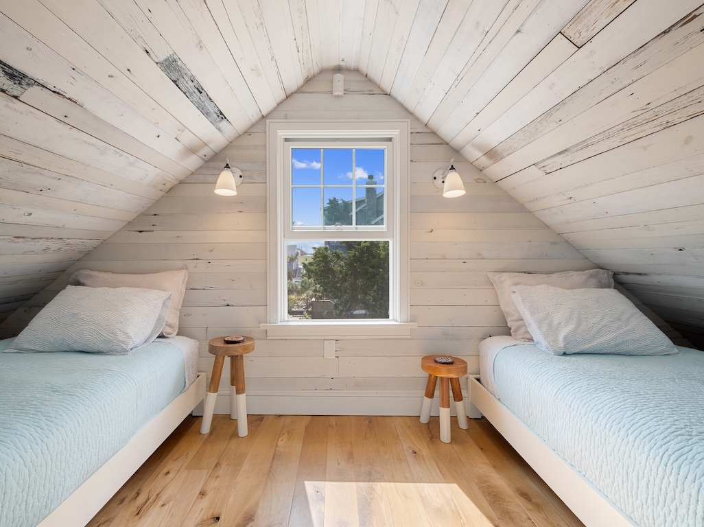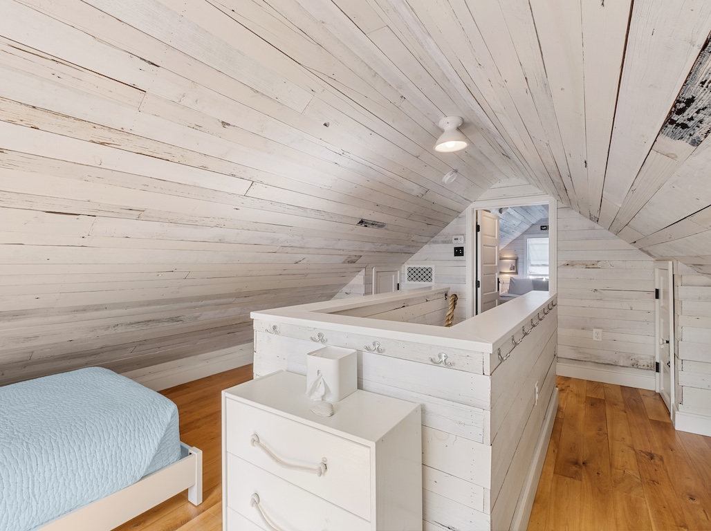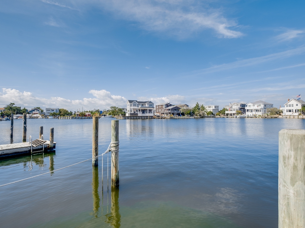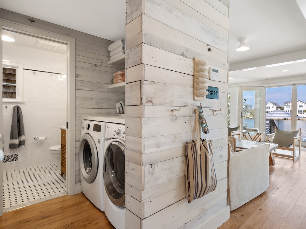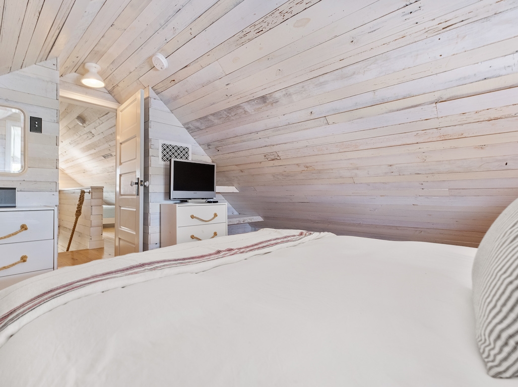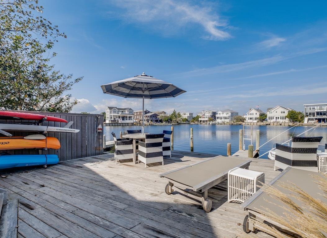 Swim or lounge in the cove's calm waters, SUP or kayak out to sheltered Barnegat Bay. Head around to the enclosed outdoor shower for a rinse. Back inside on the ground floor is a bedroom and bathroom with tub and shower, and a laundry nook with full-sized washer and dryer. Head up the stairs to the fully finished attic bedroom with queen bed overlooking the cove and the sleeping loft with two twin beds and room to play in between. Open all the windows and let the beach and bay breezes flow through the house or cool off with 2 zoned central air-conditioning.
