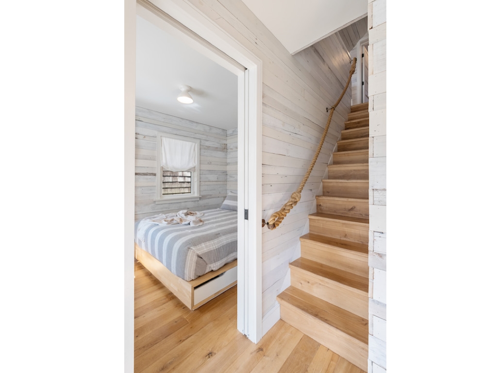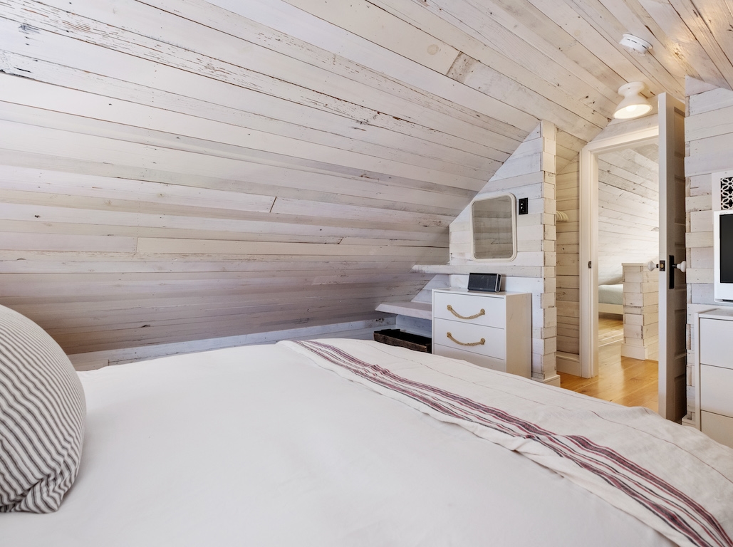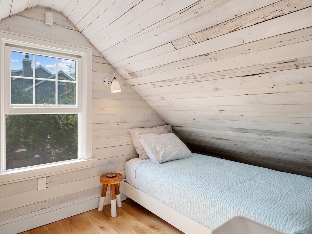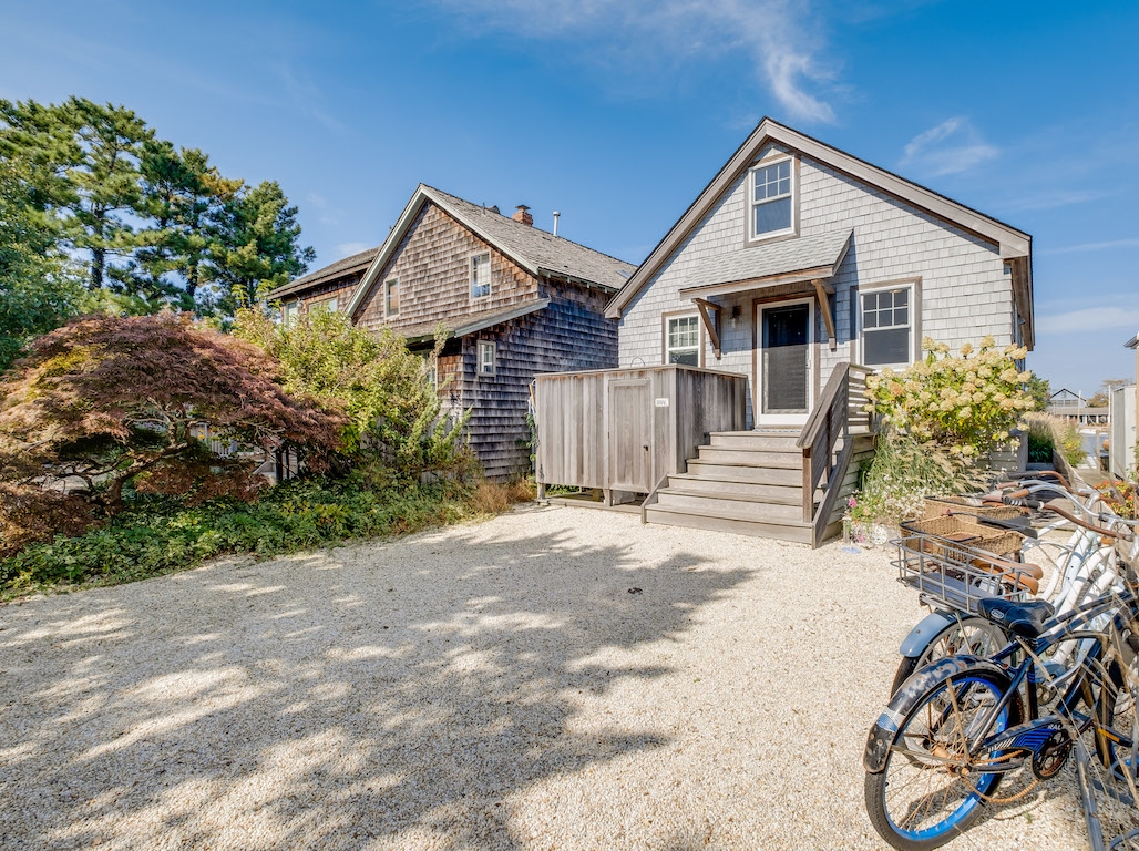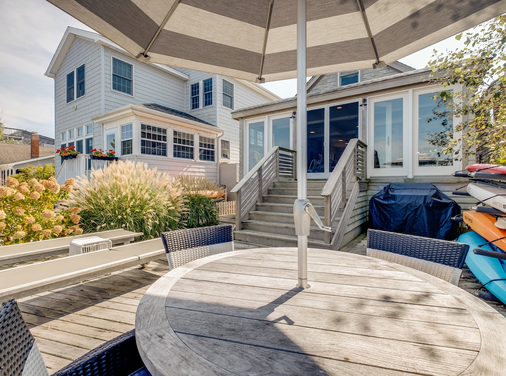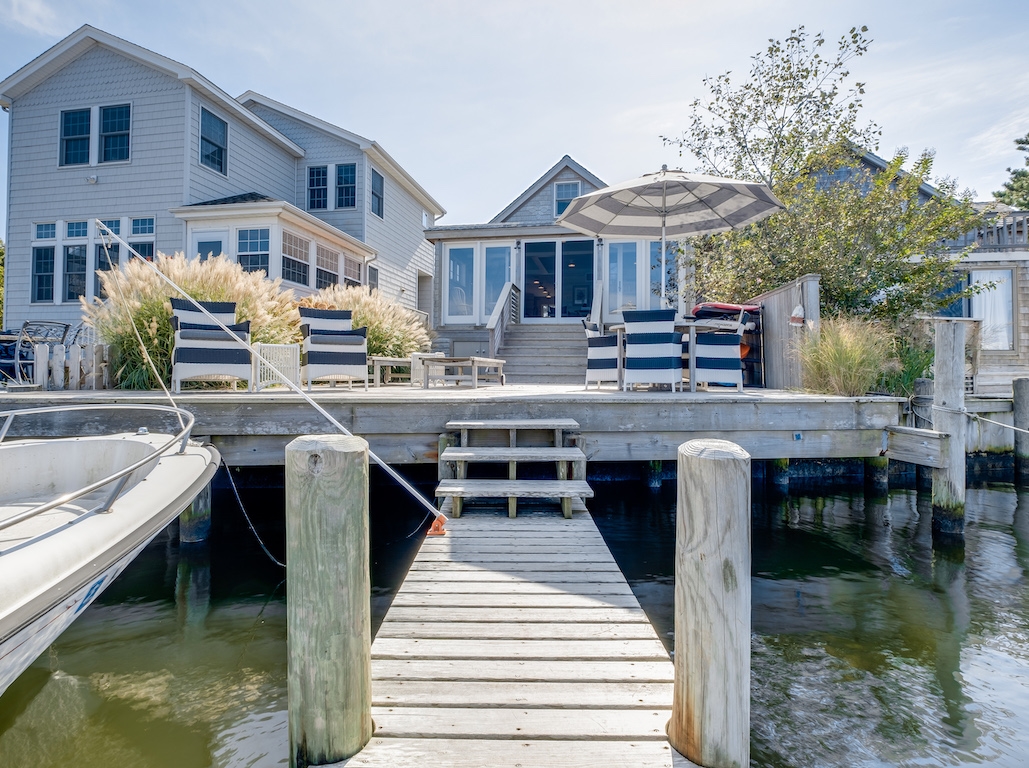 Swim or lounge in the cove's calm waters, SUP or kayak out to sheltered Barnegat Bay. Head around to the enclosed outdoor shower for a rinse. Back inside on the ground floor is a bedroom and bathroom with tub and shower, and a laundry nook with full-sized washer and dryer. Head up the stairs to the fully finished attic bedroom with queen bed overlooking the cove and the sleeping loft with two twin beds and room to play in between. Open all the windows and let the beach and bay breezes flow through the house or cool off with 2 zoned central air-conditioning.