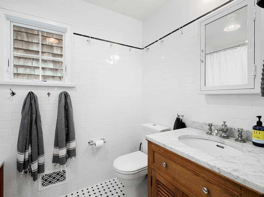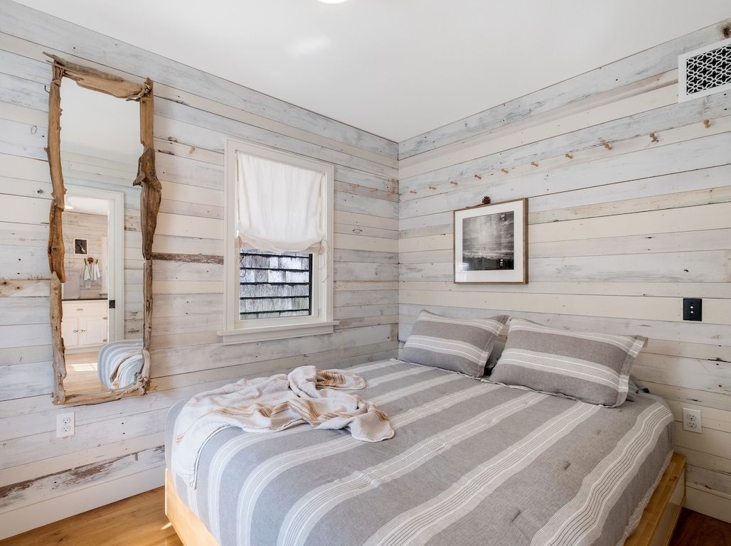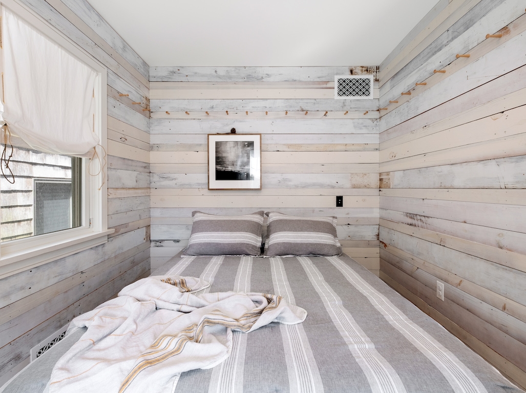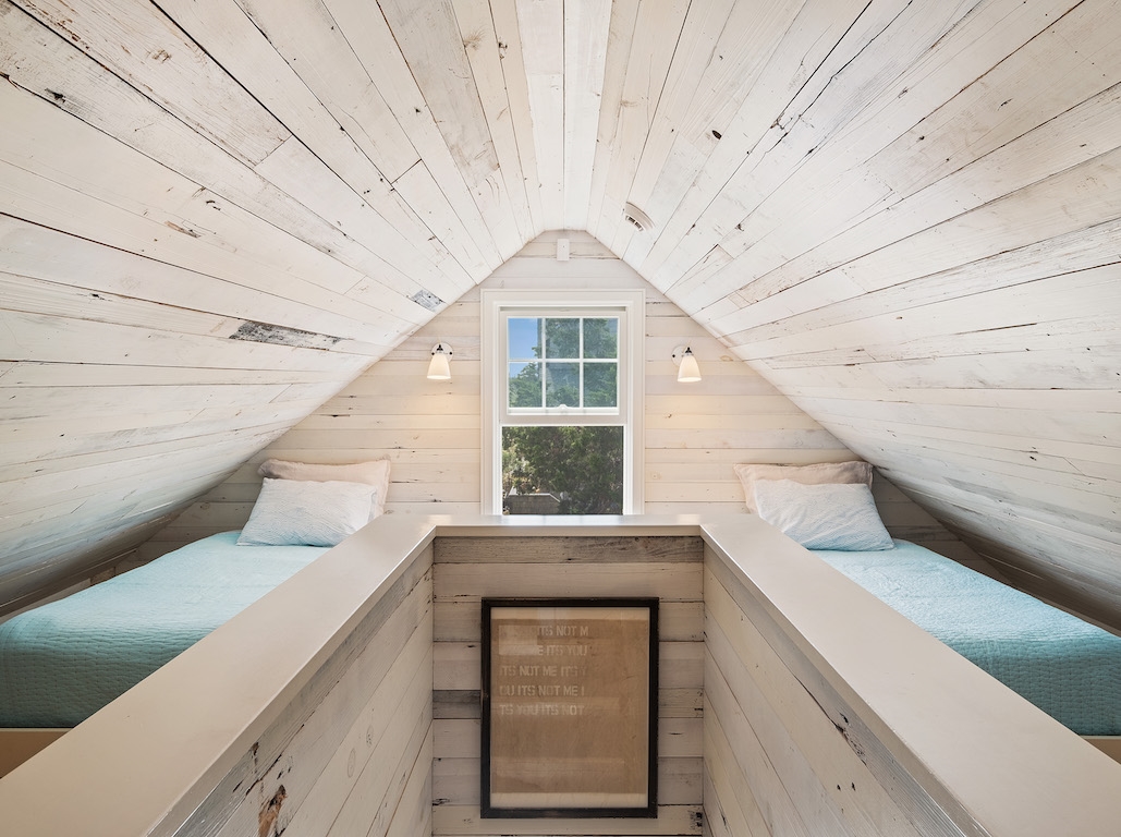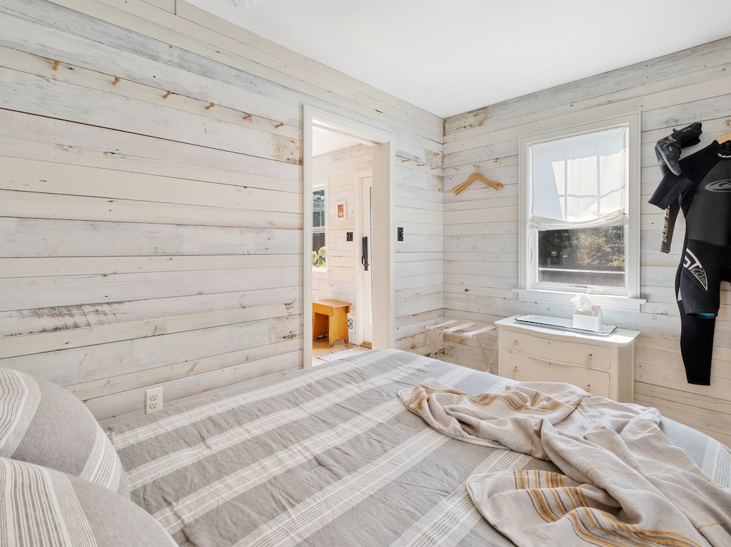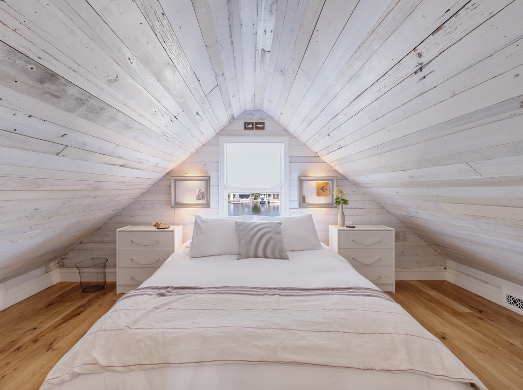 Swim or lounge in the cove's calm waters, SUP or kayak out to sheltered Barnegat Bay. Head around to the enclosed outdoor shower for a rinse. Back inside on the ground floor is a bedroom and bathroom with tub and shower, and a laundry nook with full-sized washer and dryer. Head up the stairs to the fully finished attic bedroom with queen bed overlooking the cove and the sleeping loft with two twin beds and room to play in between. Open all the windows and let the beach and bay breezes flow through the house or cool off with 2 zoned central air-conditioning.