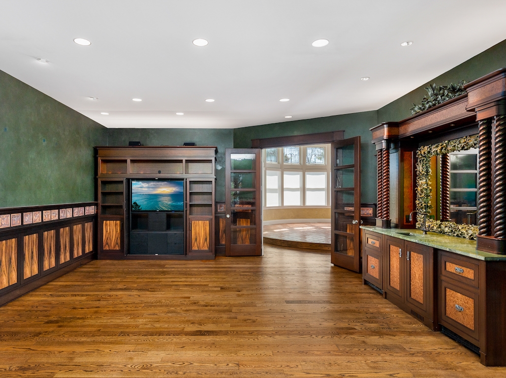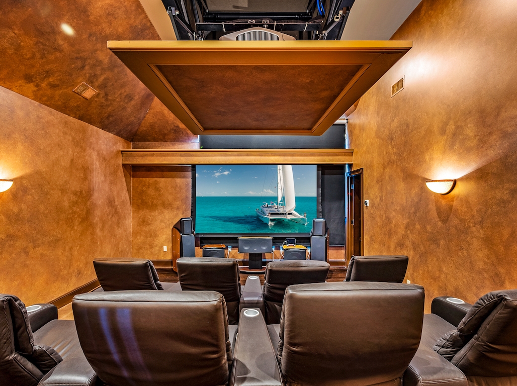 The interior spaces are equally grand. In the main house you’ll enjoy cooking in your gourmet kitchen with mahogany cabinets and a Calacatta marble countertop fitted with WOLF and Sub-Zero appliances. Double-sided fireplace in the conservatory and living area with mahogany cabinets and tiger’s eye pulls. The billiards room has a high European style chair rail with stunning African rosewood paneling below. Full wet bar with ice maker, wine and beverage fridge. Cozy theatre room with Crestron audio video controls and 8 electric reclining chairs.