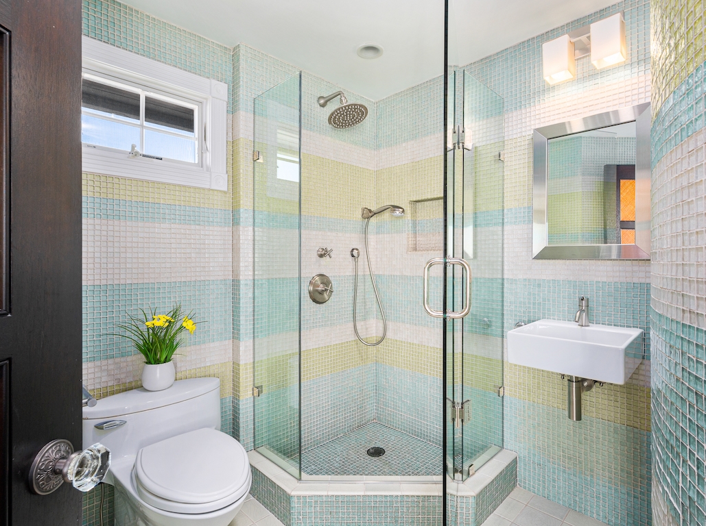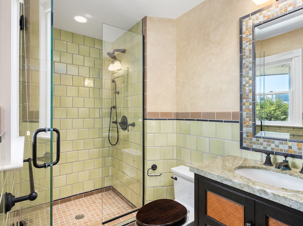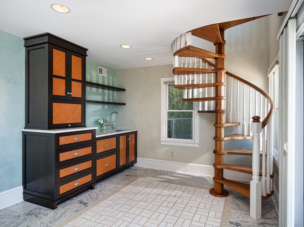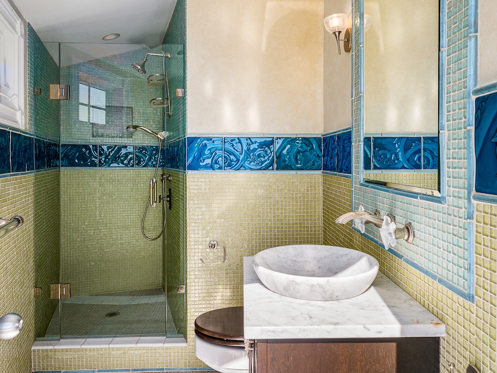 The guest house features a kitchenette with hand-made crackle ceramic floor on the first level and a full bed and bath suite above. Ideal for the weekend guests. Attached to the guest house is a full bath for pool goers with craftsman designed sea serpent glass tiles.